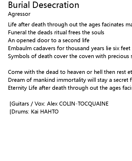 | Burial desecreation Musicians: Guitars Vox: Alex COLINTOCQUAINE Bass: Jo l GUIGOU Drums: Kai HAHTO |