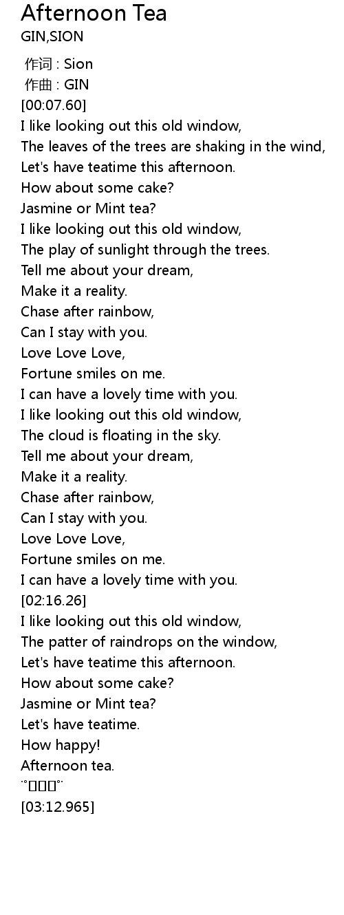 | [00:29.77] | Let' s have teatime this afternoon. |