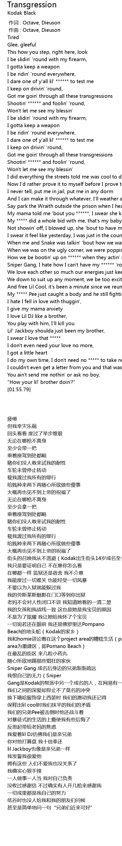 | [00:38.76] | 街头的召唤我从不逃避(Kodak出生街头14岁成名至今入狱多次,本张专辑即出狱后的作品,前所未有地展现其反思与成熟) |