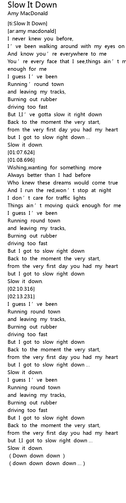 | [00:47.227] | But I,I ’ve gotta slow it right down |