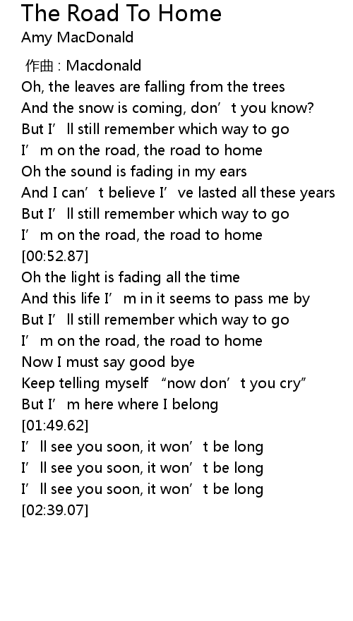 | [00:47.54] | I’m on the road, the road to home |