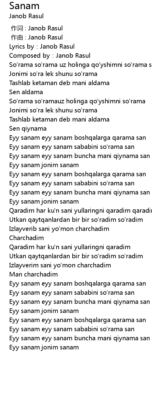 | [02:34.154] | Eyy sanam eyy sanam boshqalarga qarama san |