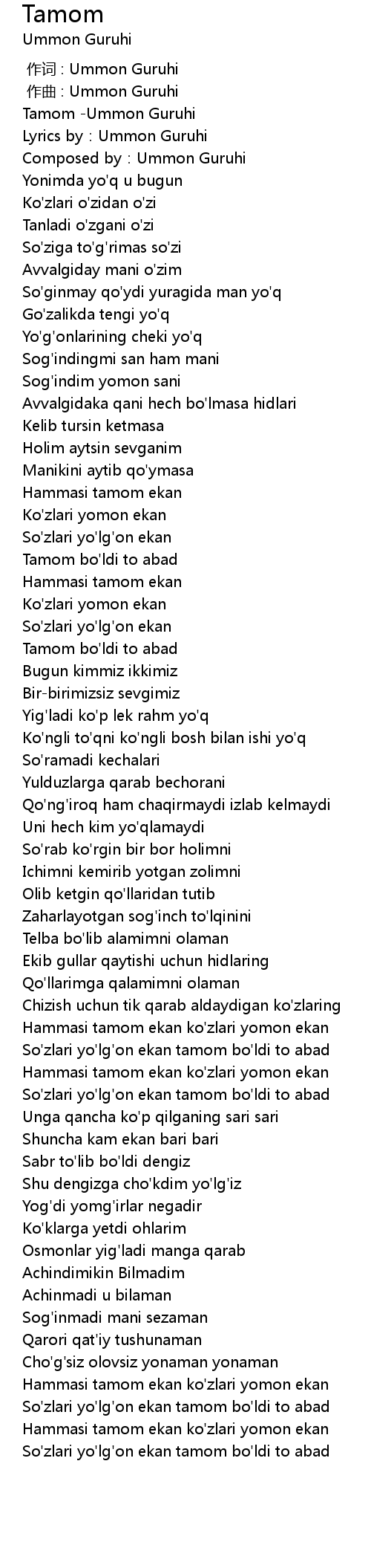 | [02:11.317] | Hammasi tamom ekan ko'zlari yomon ekan |