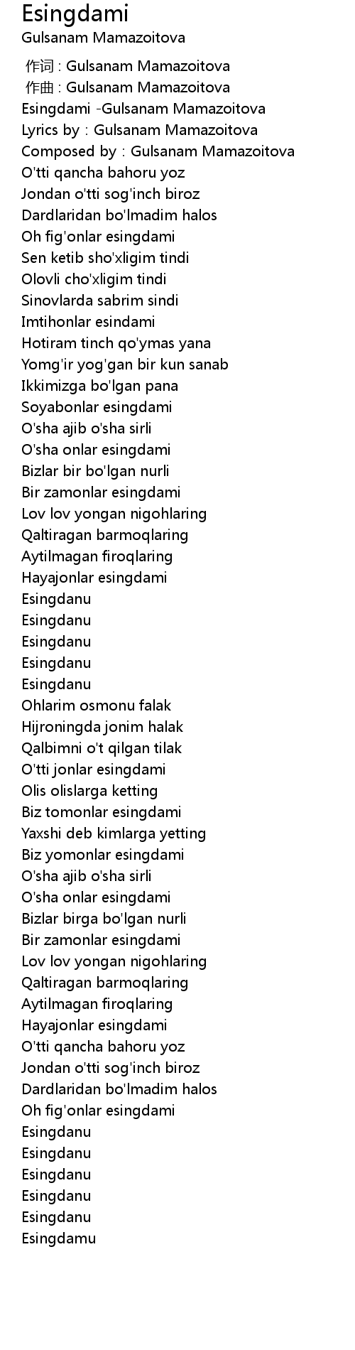 | [00:00.432] | Esingdami -Gulsanam Mamazoitova |