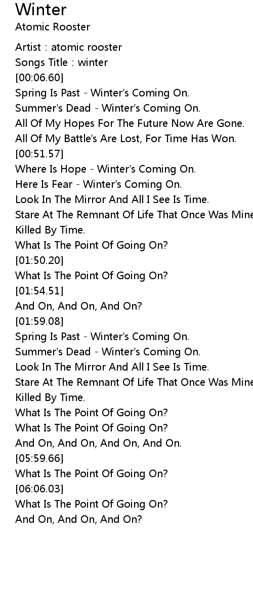 | [00:31.21] | Summer's Dead - Winter's Coming On. |