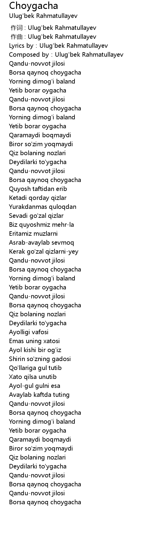 | [00:04.40] | Lyrics by:Ulug'bek Rahmatullayev |