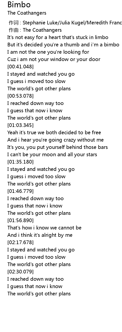 | [00:26.162] | But it' s decided you' re a thumb and i' m a bimbo |