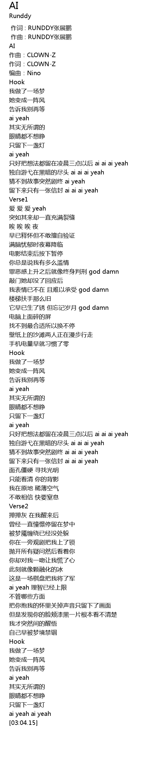 | [00:38.57] | 猜不到故事突然剧终 ai yeah |