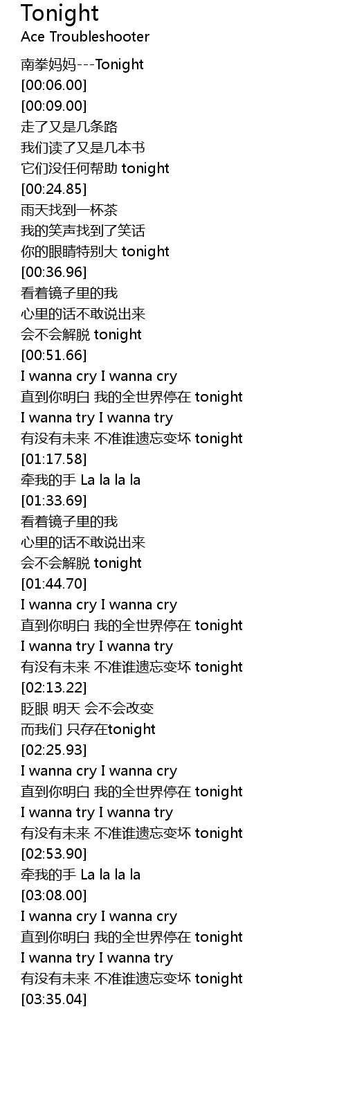 | [02:43.61] | yǒu méi yǒu wèi lái bù zhǔn shuí yí wàng biàn huài tonight |