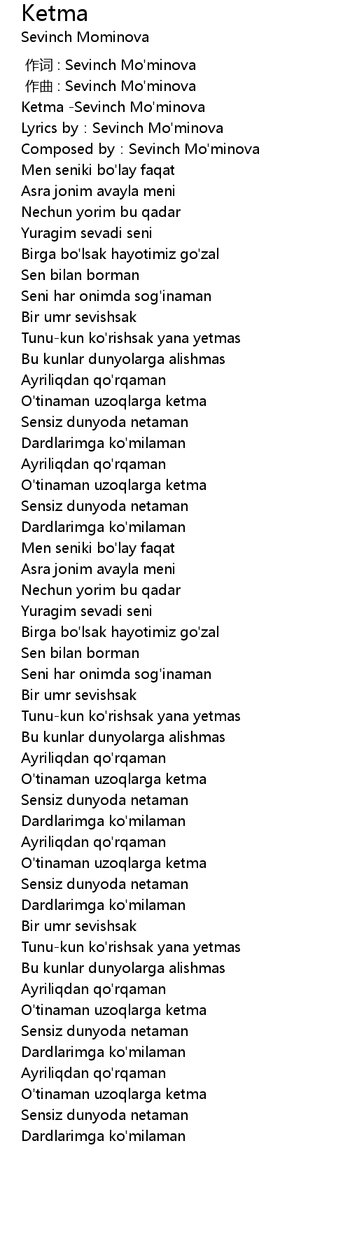 | [00:00.000] | 作词 : Sevinch Mo'minova |
