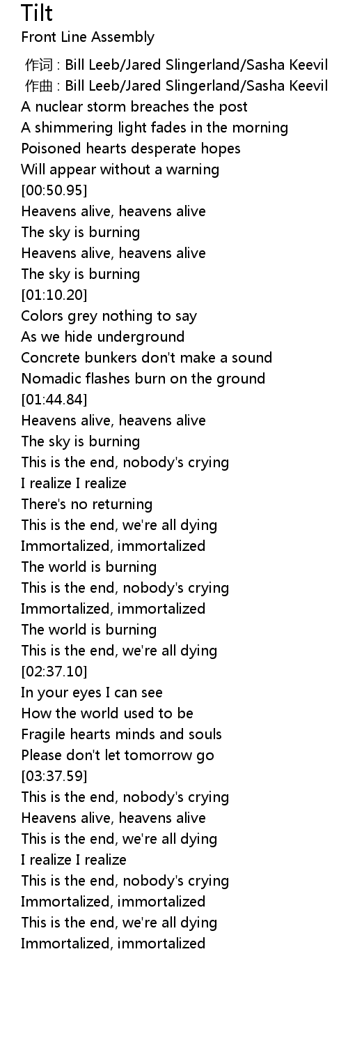 | [00:00.000] | 作词 : Bill Leeb/Jared Slingerland/Sasha Keevil |
