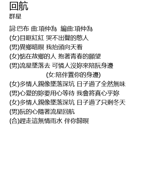 | (男)流星墜落去 可憐人沒妳來陪阮身邊 | |