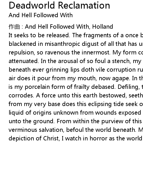 | It seeks to be released. The fragments of a once brightened disposition are blackened in misanthropic digust of all that has unsettled from within: in mere repulsion, so ravenous the innermost. My form contorts in disbelief, my patience attenuated. In the arousal of so foul a stench, my very structure distorts. From beneath ever grinning lips doth vile corruption run.. As black as the midnight air does it pour from my mouth, now agape. In the amorous arms of iniquity held is my porcelain form of frailty debased. Defiling, the ground beneath me now corrodes. A force unto this earth bestowed, seething in noxious lament. Pooling from my very base does this eclipsing tide seek only to envelope. This loathsome liquid of origins unknown from wounds exposed has run from this, my temple, now unto the ground. From within the purview of this darkest deception does this, oh verminous salvation, befoul the world beneath. My arms now opened in cruel depiction of Christ, I watch in horror as the world diminishes. |