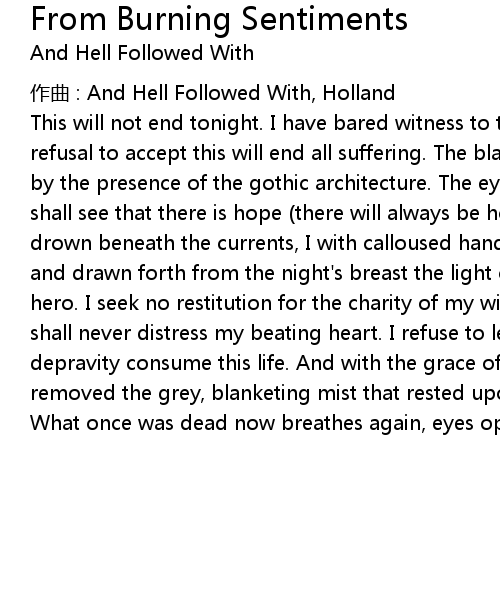 | This will not end tonight. I have bared witness to tragedy in many and my refusal to accept this will end all suffering. The blackened horizon beclouded by the presence of the gothic architecture. The eyes of this decaying waste shall see that there is hope there will always be hope. And in my refusal to drown beneath the currents, I with calloused hands have reached into the abyss and drawn forth from the night' s breast the light of another once faded. I am no hero. I seek no restitution for the charity of my will. My coruscated pasts shall never distress my beating heart. I refuse to let the voracious tides of depravity consume this life. And with the grace of my comforting hand, I have removed the grey, blanketing mist that rested upon her eyes in seek of eternity. What once was dead now breathes again, eyes open to the world around. |
