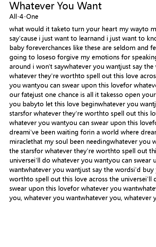 | what would it taketo turn your heart my wayto move you with each word that i say'cause i just want to learnand i just want to knowi just want to hold you baby foreverchances like these are seldom and fewand this is one chance i'm not going to loseso forgive my emotions for speaking out loudbut every time you're around i won't saywhatever you wantjust say the wordsi'd buy you the starsfor whatever they're worthto spell out this love across the universei'll do whatever you wantyou can swear upon this lovefor whatever you wantjust one kisswould seal our fatejust one chance is all it takesso open your souland let me init's up to you babyto let this love beginwhatever you wantjust say the wordsi'd buy you the starsfor whatever they're worthto spell out this love across the universei'll do whatever you wantyou can swear upon this lovefor whatever you wantyou're the dreami've been waiting forin a world where dreams are fleetingyour love is a miraclethat my soul been needingwhatever you wantjust say the wordsi'd buy you the starsfor whatever they're worthto spell out this love across the universei'll do whatever you wantyou can swear upon this lovefor whatever you wantwhatever you wantjust say the wordsi'd buy you the starsfor whatever they're worthto spell out this love across the universei'll do whatever you wantyou can swear upon this lovefor whatever you wantwhatever you, whatever you wantwhatever you, whatever you wantwhatever you, whatever you wantfor whatever you want |