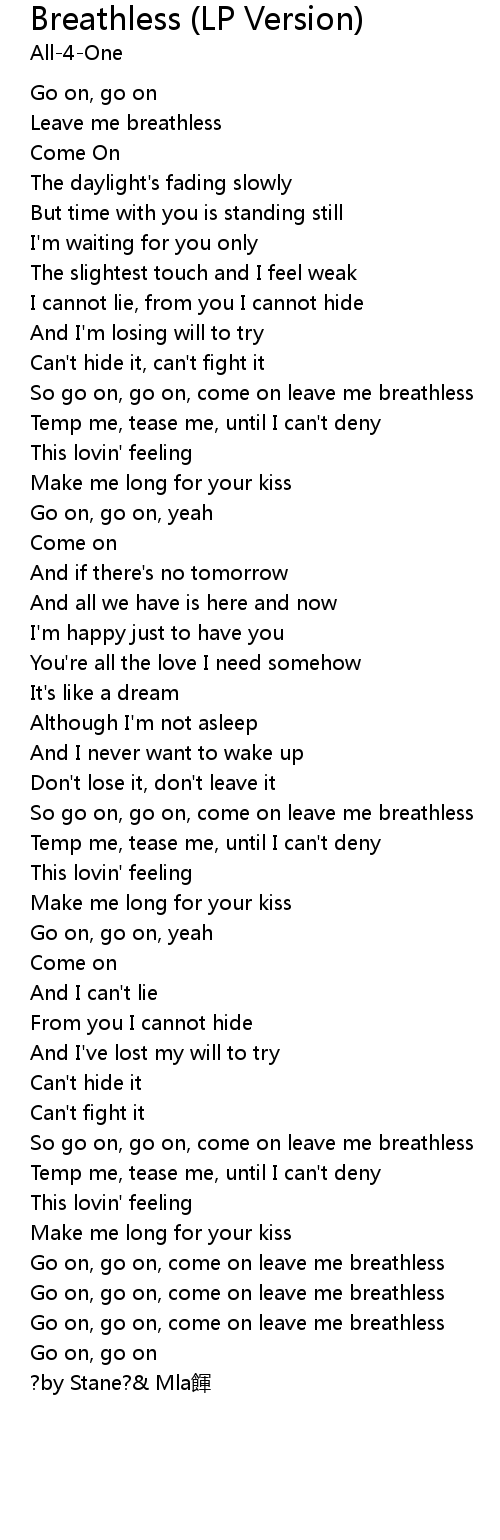 | [00:49.00] | So go on, go on, come on leave me breathless |