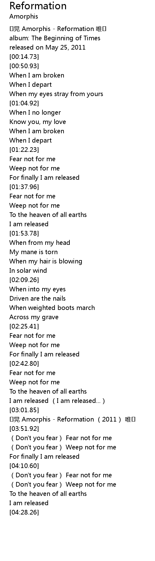 | [00:00.00] | huǎng Amorphis Reformation wéi |