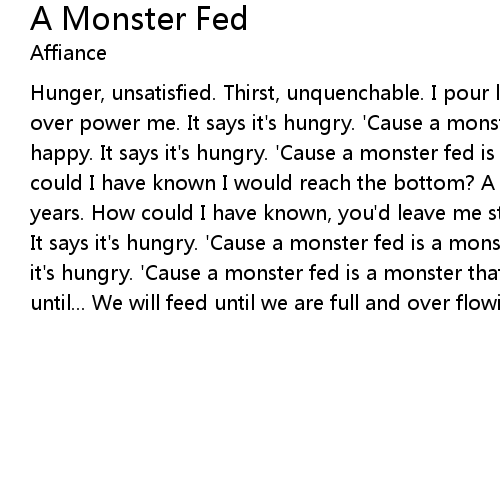 it's hungry. 'Cause a monster fed is a monster that's happy. Oh, we will feed |
