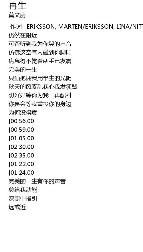 | [00:00.00] | 作词 : ERIKSSON, MARTEN/ERIKSSON, LINA/NITT, DANIEL/陳, 信延 |