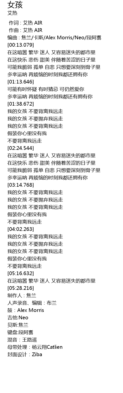 | [00:12.229] | biān qǔ : jiāo lán kǎ sī Alex Morris Neo duàn ā zhù |