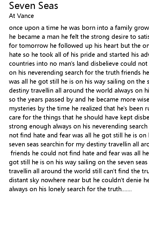 | once upon a time he was born into a family growin with the right to fight when he became a man he felt the strong desire to satisfy his restless soul headin for tomorrow he followed up his heart but the only thing he found was war and hate so he took all of his pride and started his adventure towards foreign countries into no man's land disbelieve could not make him strong enough always on his neverending search for the truth friends he could not find hate and fear was all he got still he is on his way sailing on the seven seas searchin for my destiny travellin all around the world always on his lonely search for the truth so the years passed by and he became more wise knowin all about the uncovered mysteries by the time he realized that he's been runnin 'round in circles didn't care for the things that he should have kept disbelieve could not make him strong enough always on his neverending search for the truth friends he could not find hate and fear was all he got still he is on his way sailing on the seven seas searchin for my destiny travellin all around the world still can't find the truth in me [Solo] friends he could not find hate and fear was all he got still he is on his way sailing on the seven seas searchin for my destiny travellin all around the world still can't find the truth in me far beyond the distant sky nowhere near but he couldn't denie headin towards his wildest dreams always on his lonely search for the truth....... |