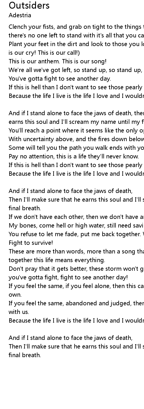 | Clench your fists, and grab on tight to the things that you hold true. When there's no one left to stand with it's all that you can do. | |