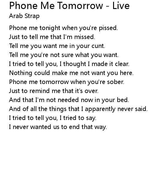 | Phone me tonight when you're pissed. | |