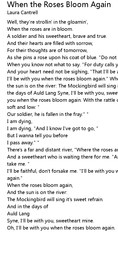 I'll be with you when the roses bloom again." When the roses bloom again, And the sun is on the river: The Mockingbird will sing it's sweet refrain. And in the days of Auld Lang Syne, I'll be with you, sweetheart mine. Oh, I'll be with you when the roses bloom again. With the rattle of the battle, Came a whisper soft and low: " |