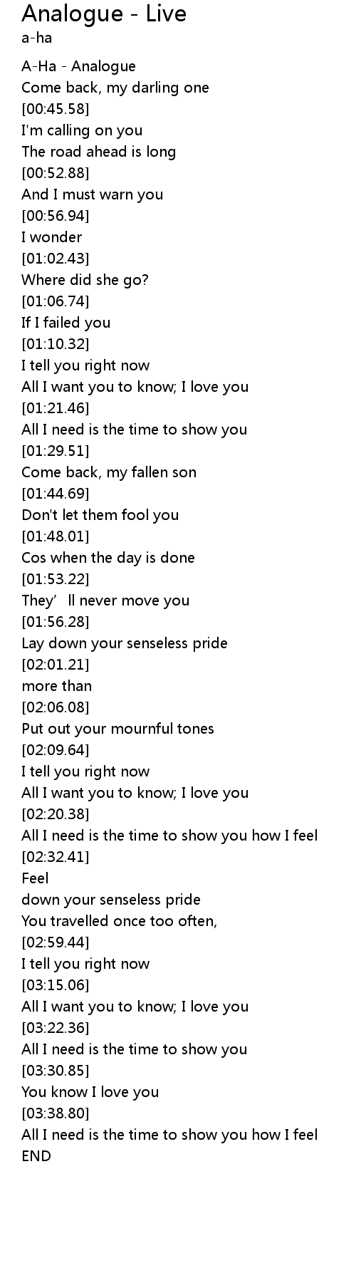 | [00:01.50] | A-Ha - Analogue |
