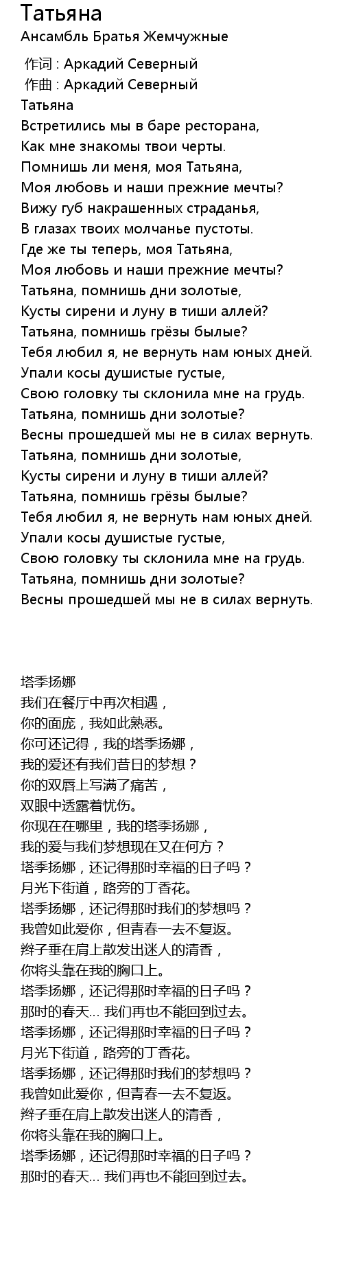 | [01:36.199] | 你可还记得,我的塔季扬娜, |