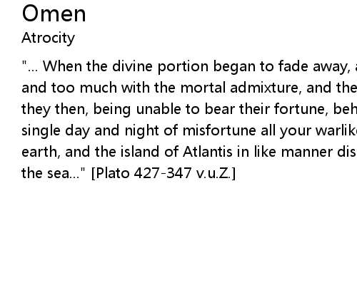 | "... When the divine portion began to fade away, and became diluted too often and too much with the mortal admixture, and the human nature got the upper hand, they then, being unable to bear their fortune, behaved unseemly... ...and in a single day and night of misfortune all your warlike men in a body sank into the earth, and the island of Atlantis in like manner disappeared into the depths of the sea..." [Plato 427-347 v.u.Z.] |