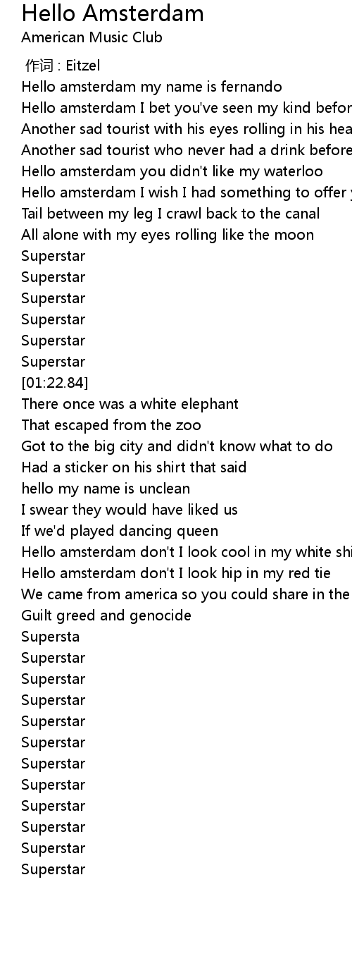 | [00:46.22] | Hello amsterdam I wish I had something to offer you |