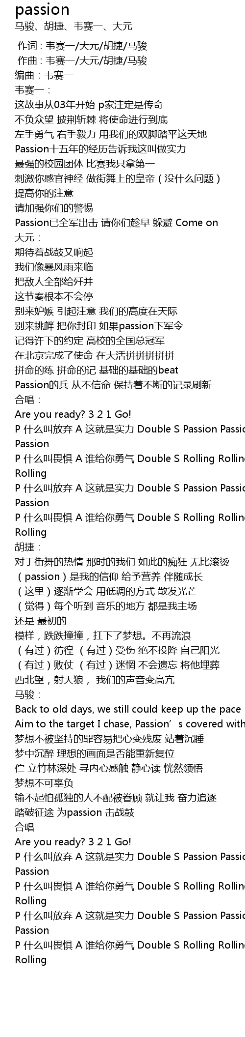 | [01:14.552] | P shén me jiào fàng qì A zhè jiù shì shí lì Double S Passion Passion Passion Passion |