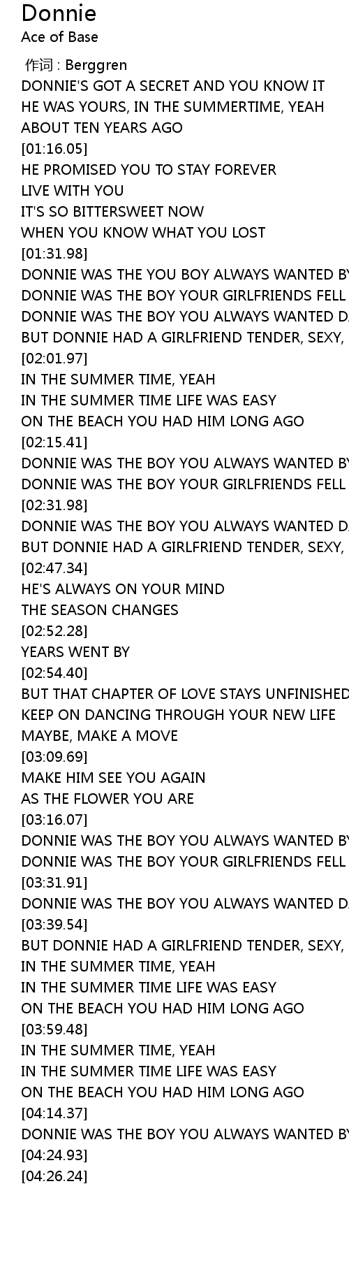 | [04:18.06] | DONNIE WAS THE BOY YOU ALWAYS WANTED BY YOUR SIDE... |