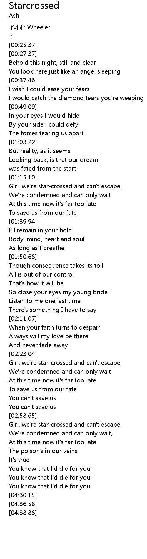 | [03:22.27] | Girl, we're star-crossed and can't escape, |