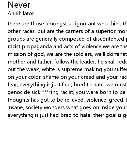 there are those amongst us ignorant who think that they are not only superior to other races, but are the carriers of a superior morality and culture, these groups are generally composed of discontented people who target others with racist propaganda and acts of violence we are the children, we are the ones on a mission of god, we are the soldiers, we'll dominate, you'll beg like a dog mother and father, follow the leader, he shall redeem, take down minority, wipe out the weak, white is supreme making you suffer, making you feel disgrace shame on your color, shame on your creed and your race prey on the anger, prey on the fear, everything is justified, bred to hate, we must never forget the goal is genocide sick ****ing racist, you were born to be deceived, command of all your thoughts has got to be relieved, violence, greed, bigotry, your messages are all insane, society wonders what goes on inside your brain prey on the anger, everything is justified bred to hate, their goal is genocide never forget |