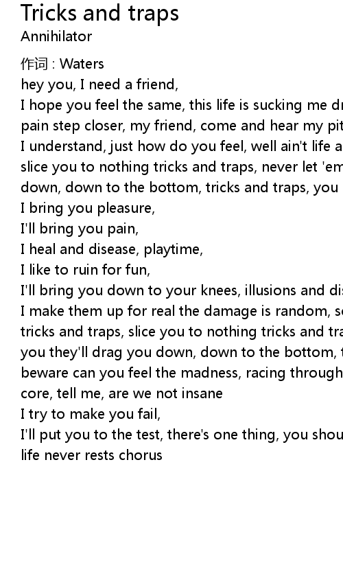| I make them up for real the damage is random, so believe me, it's time to kneel tricks and traps, slice you to nothing tricks and traps, never let 'em get to you they'll drag you down, down to the bottom, tricks and traps, you better beware can you feel the madness, racing through the brain, psychedelic to the core, tell me, are we not insane | |