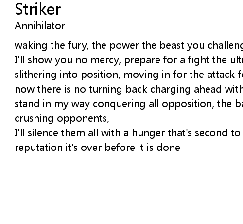 | I'll show you no mercy, prepare for a fight the ultimate force is at hand slithering into position, moving in for the attack forging ahead with precision, now there is no turning back charging ahead with conviction, let no one dare stand in my way conquering all opposition, the battle is mine once again striker crushing opponents, | |