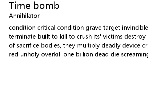| condition critical condition grave target invincible target insane built to terminate built to kill to crush its' victims destroy at will a plague of agony of sacrifice bodies, they multiply deadly device creation, time bomb condition red unholy overkill one billion dead die screaming, bleeding, pleading |