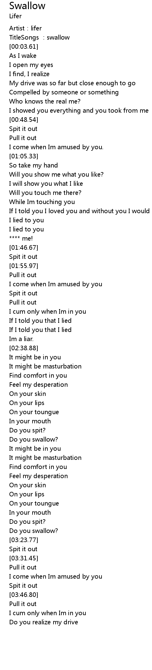 | [03:23.38] | Do you swallow? |