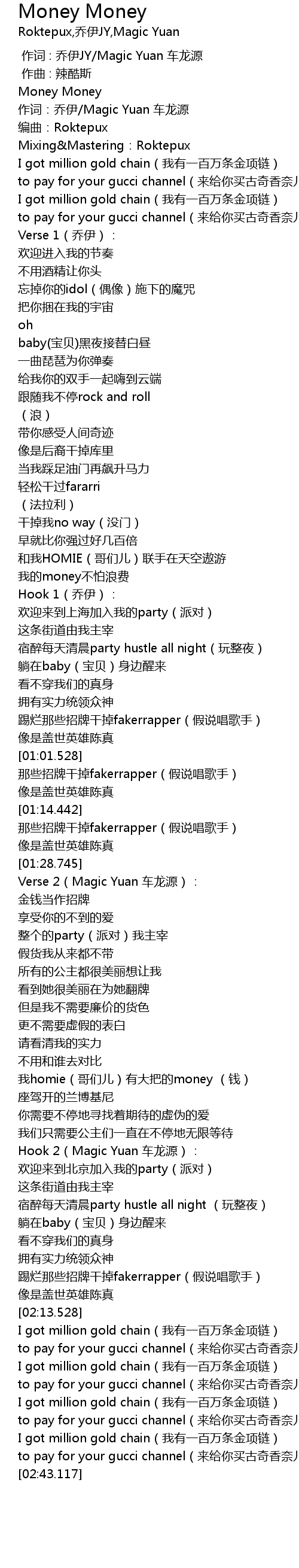 | [02:39.360] | I got million gold chain wo you yi bai wan tiao jin xiang lian |