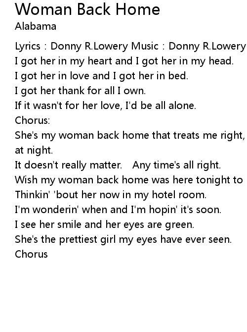 | She' s my woman back home that treats me right, early in the mornin' to late | |