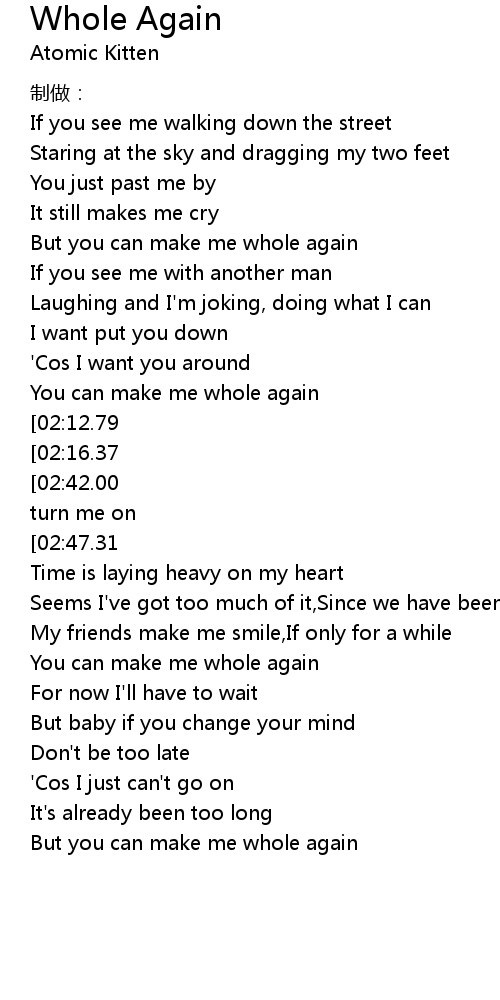 | [02:57.42][02:47.31][02:26.97][01:45.95][01:05.00] | You can make me whole again |