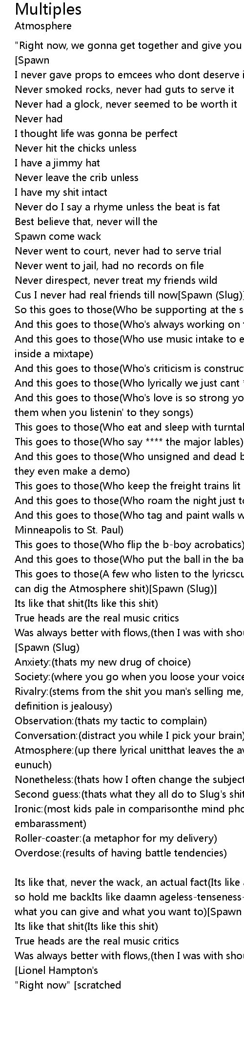 This goes to those(A few who listen to the lyricscuz this flow's for those who can dig the Atmosphere shit)[Spawn (Slug)]