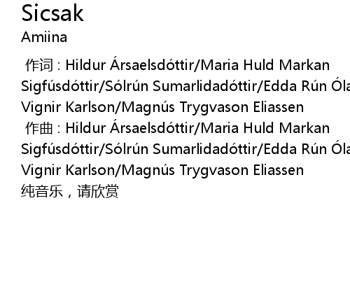 | [00:01.000] | zuò qǔ : Hildur Á rsaelsdó ttir Maria Huld Markan Sigfú sdó ttir Só lrú n Sumarlidadó ttir Edda Rú n Ó lafsdó ttir Gudmundur Vignir Karlson Magnú s Trygvason Eliassen |