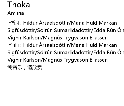 | [00:01.000] | zuo qu : Hildur Á rsaelsdo ttir Maria Huld Markan Sigfu sdo ttir So lru n Sumarlidado ttir Edda Ru n Ó lafsdo ttir Gudmundur Vignir Karlson Magnu s Trygvason Eliassen |