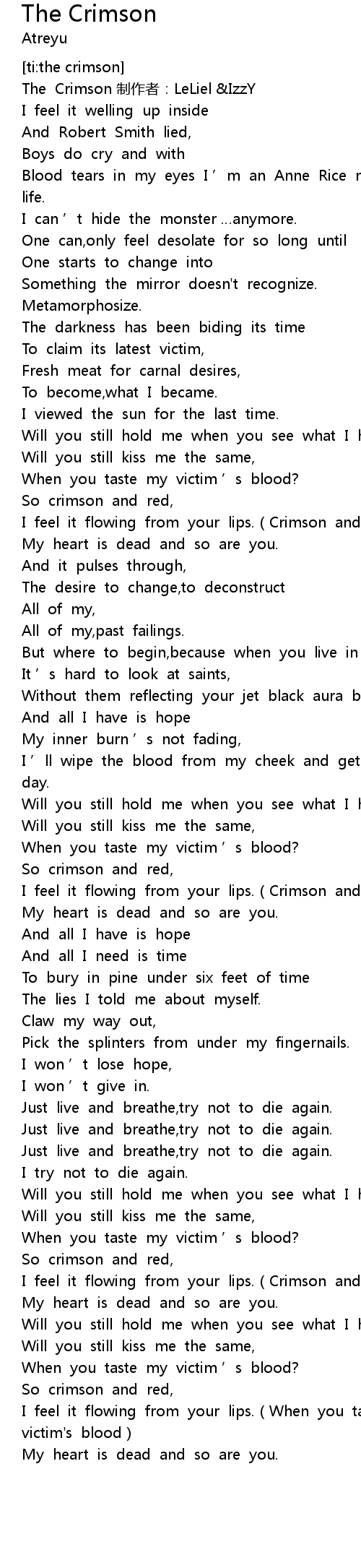 | [01:12.611] | I feel it flowing from your lips.(Crimson and red) |