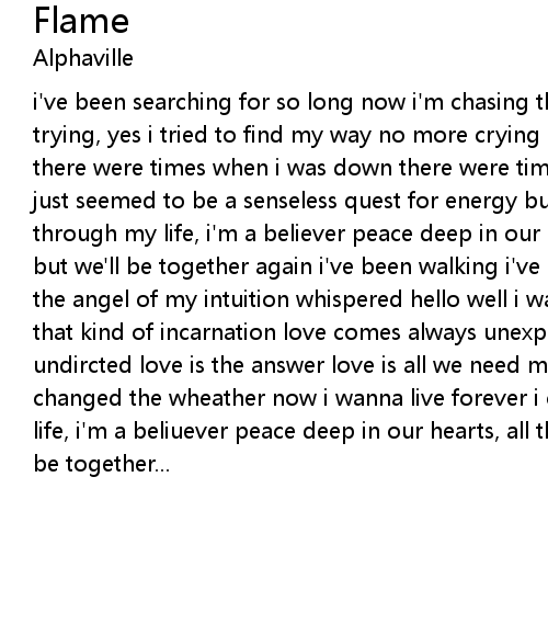 i've been searching for so long now i'm chasing the shadows away i've been trying, yes i tried to find my way no more crying in the make or break decade there were times when i was down there were times i felt so low my whole life just seemed to be a senseless quest for energy but i carry your flame all through my life, i'm a believer peace deep in our hearts, all things must pass but we'll be together again i've been walking i've been walking in the rain when the angel of my intuition whispered hello well i was quite surprised to face that kind of incarnation love comes always unexpected, love strikes blind and undircted love is the answer love is all we need my friend now you came and changed the wheather now i wanna live forever i carry your flame all through my life, i'm a beliuever peace deep in our hearts, all things must pass but we'll be together... |