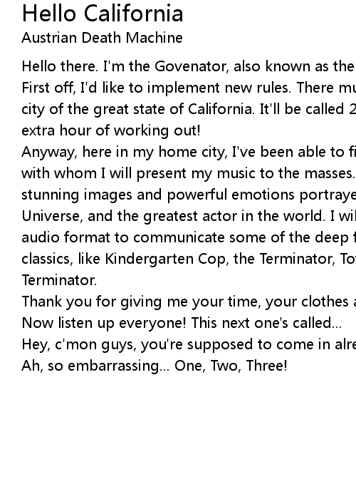 Anyway, here in my home city, I've been able to find some wonderful musicians with whom I will present my music to the masses. Some of you know my movies with stunning images and powerful emotions portrayed by none other than me, Mr. Universe, and the greatest actor in the world. I will now attempt a recorded audio format to communicate some of the deep feelings I had while filming the classics, like Kindergarten Cop, the Terminator, Total Recall and the Terminator. |