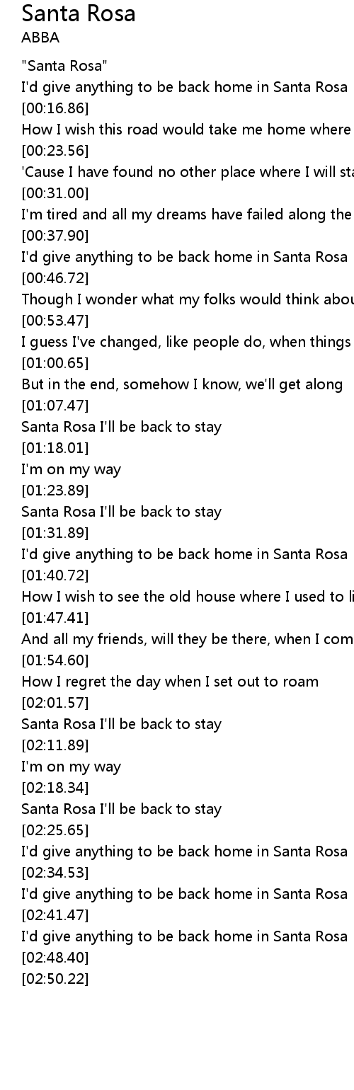 | [02:22.28] | Santa Rosa I'll be back to stay |